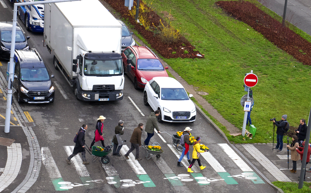 Le premier jour du printemps, nous nous sommes mobilisés à 8H pétantes pour une plantation de primevères surprise en forme de SOS sur le terre-plein central de l’avenue du Rhin. Objectif : marquer les esprits et transformer cet axe de circulation en un lieu vivable, respirable et humain.